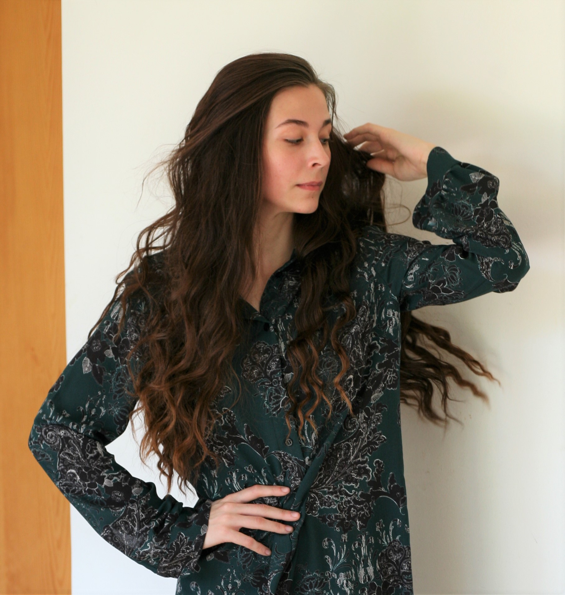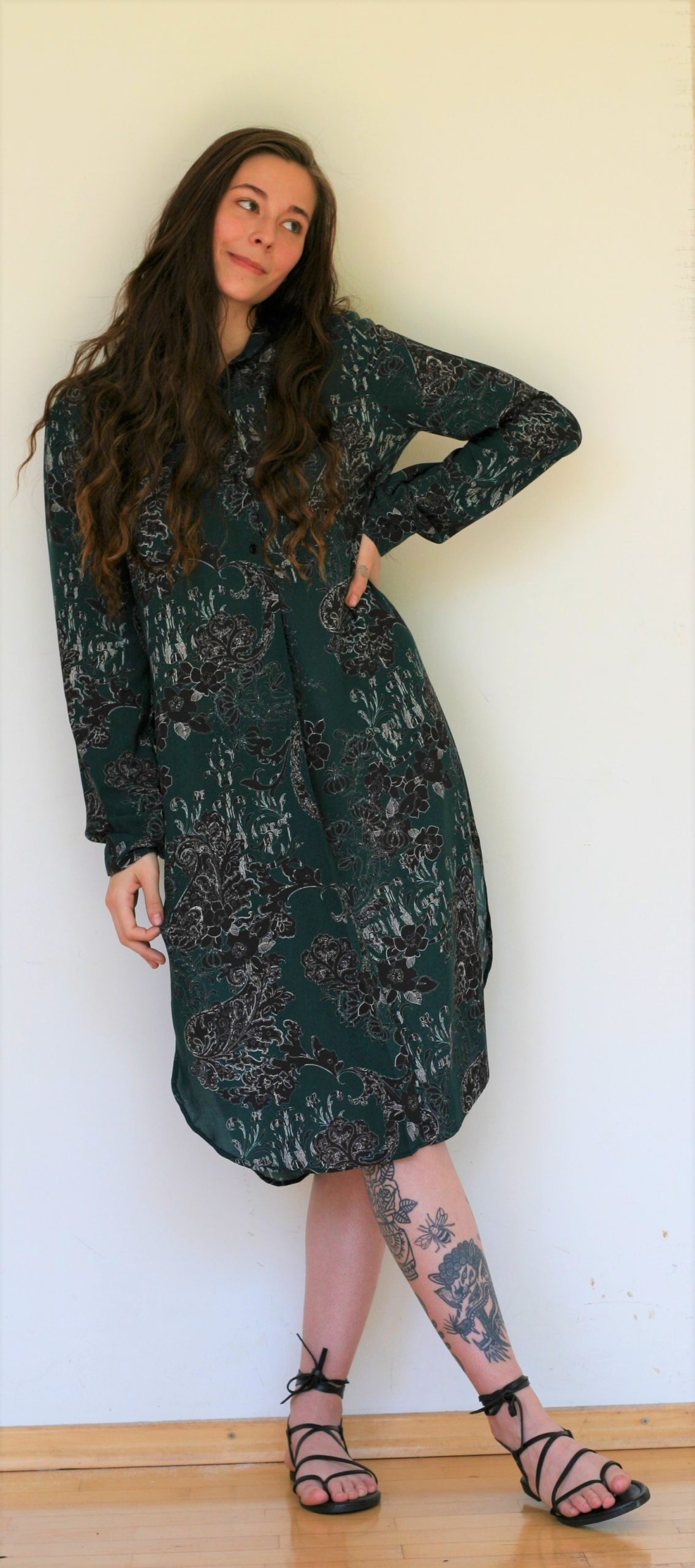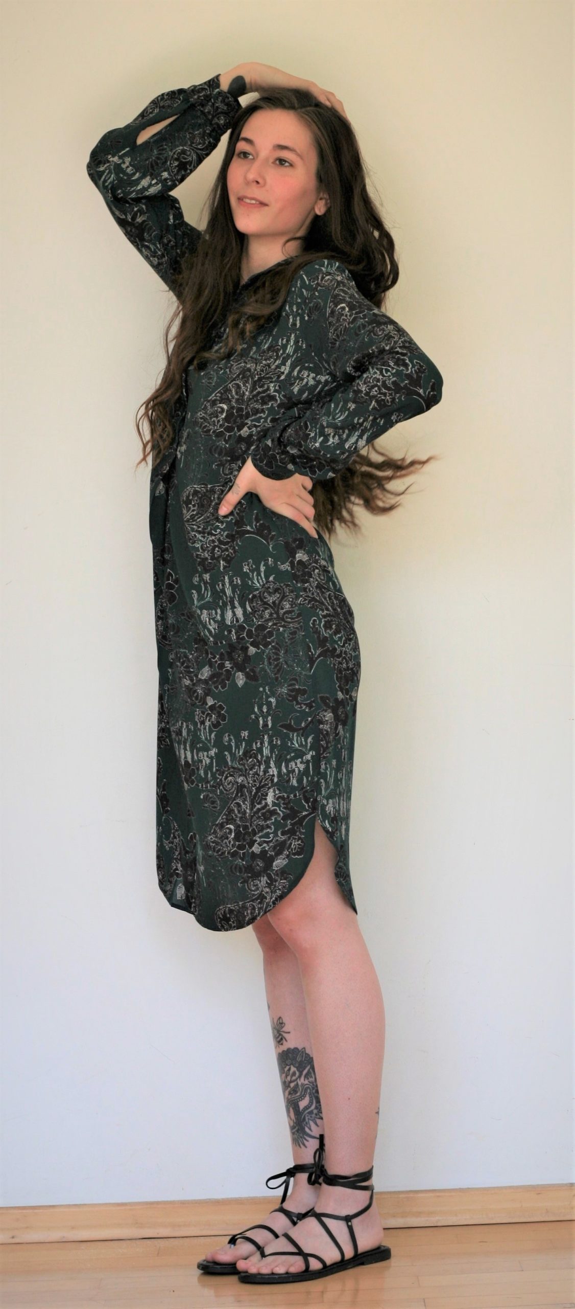 Materijal je lagan i ugodan za ljetne vrućine (100 % viskoza), crno – bijelih ornamenata na pastelnoj duboko zelenoj boji. Može se nositi i na tajice kao tunika.