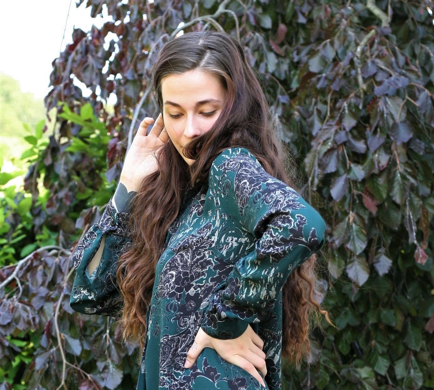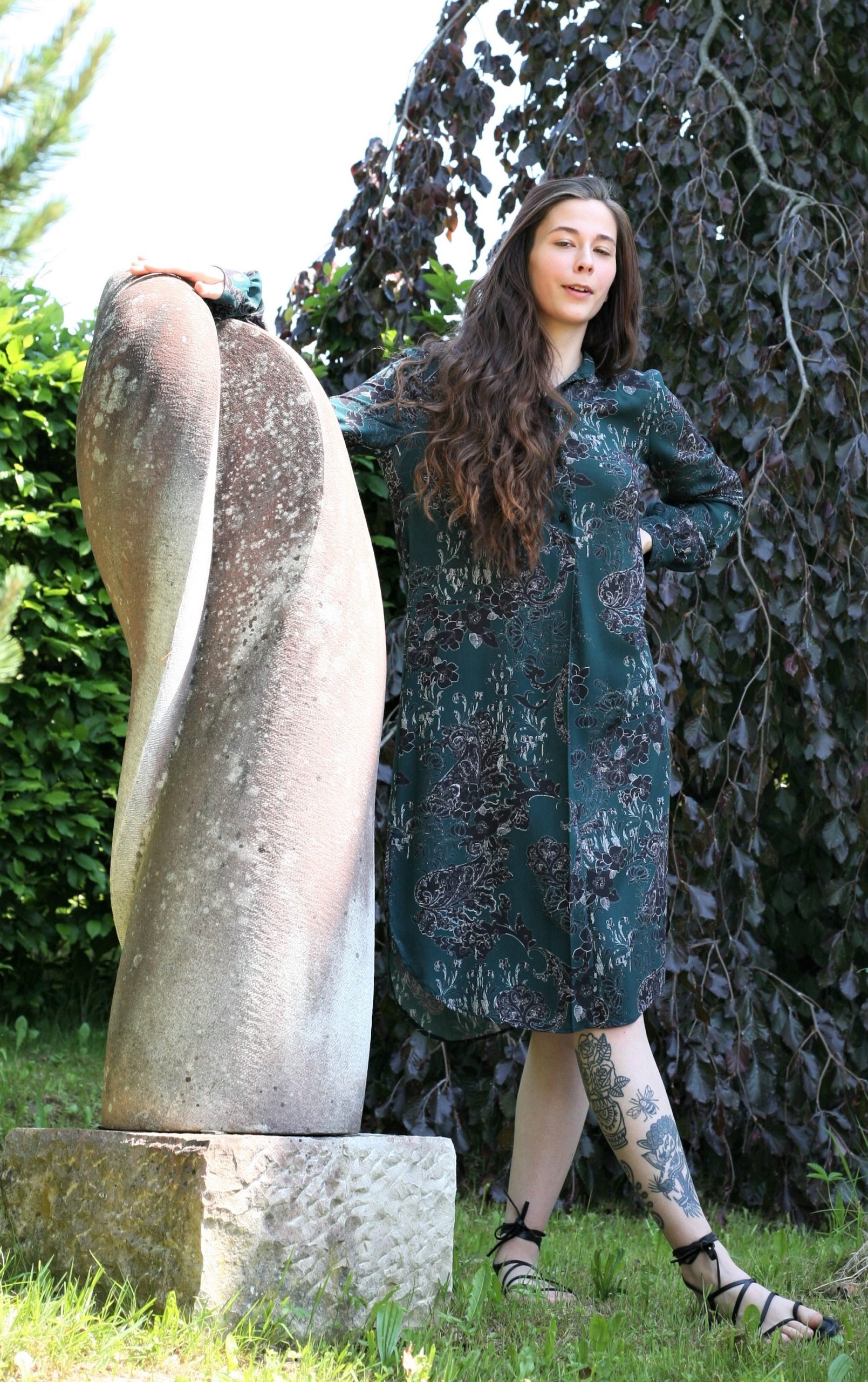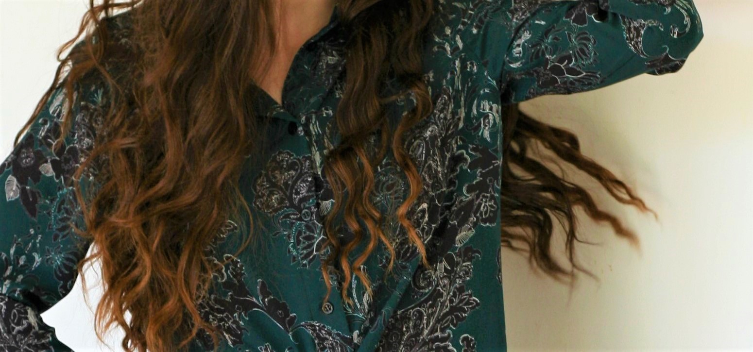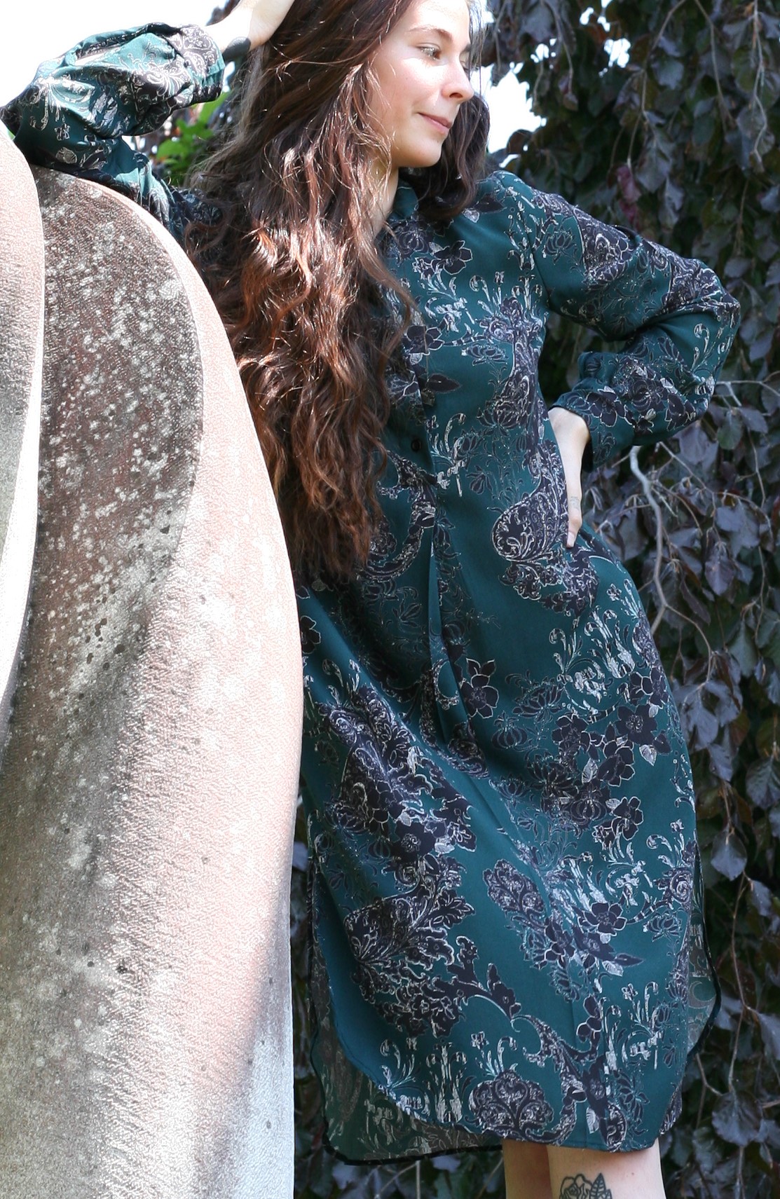 Materijal je lagan i ugodan za ljetne vrućine (100 % viskoza), crno – bijelih ornamenata na pastelnoj duboko zelenoj boji. Može se nositi i na tajice kao tunika.