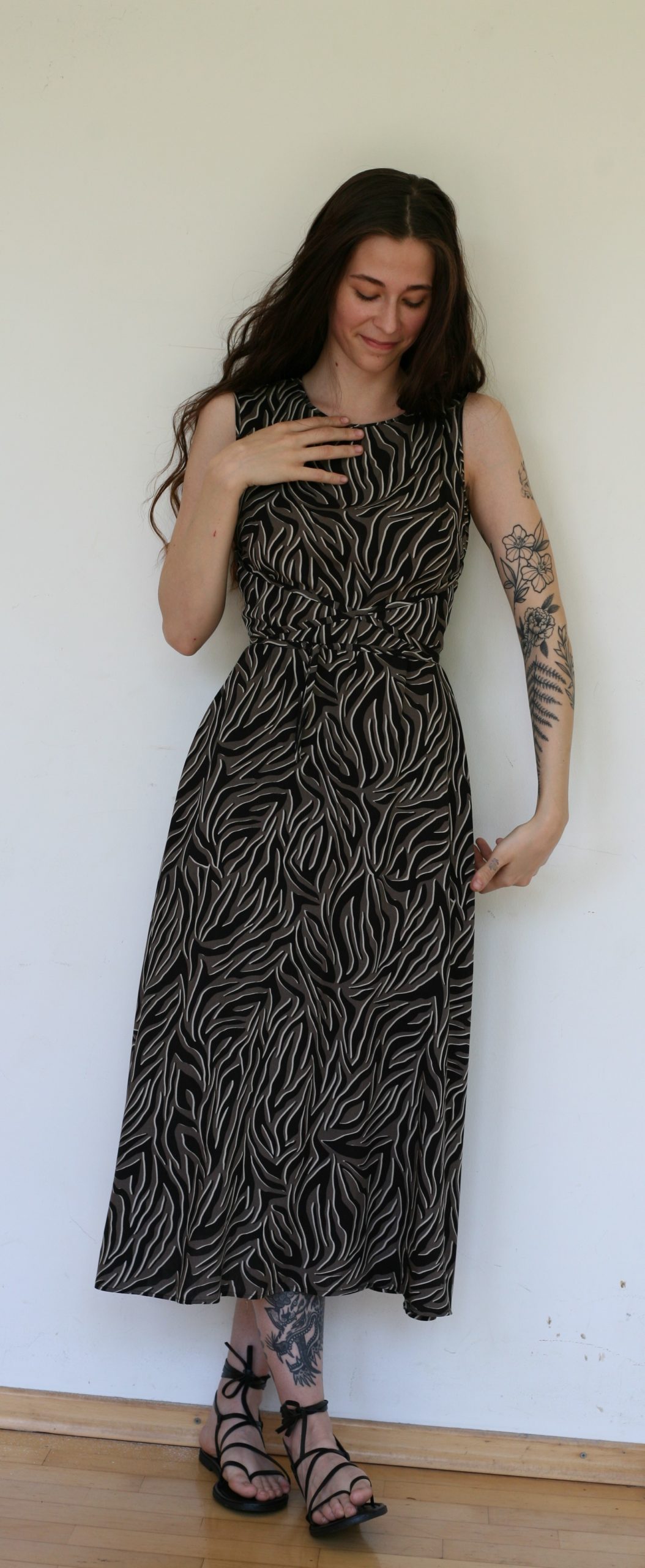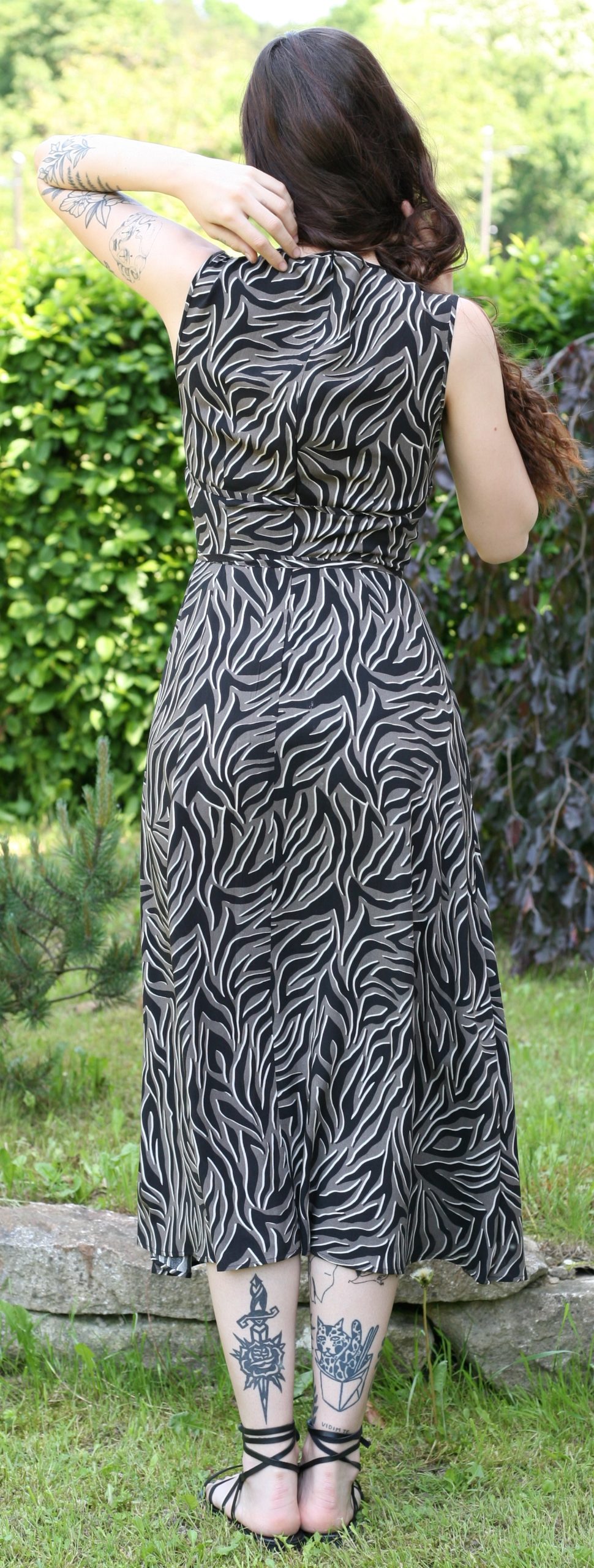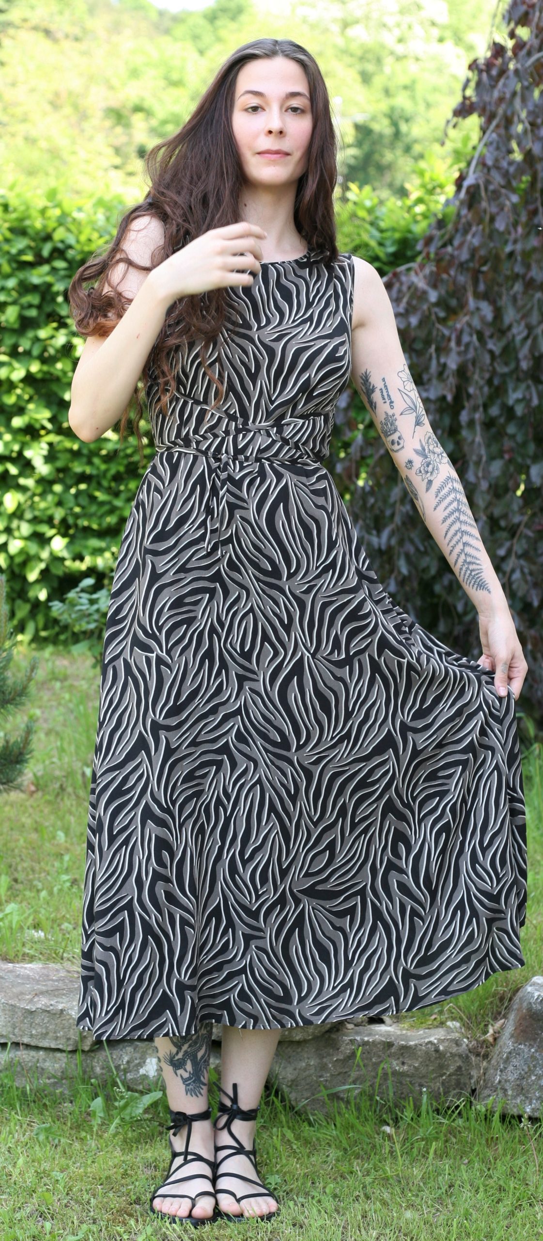Haljina Sofi izrađena je od viskoze, u gornjem dijelu krojena je uz tijelo, a u donjem se širi u blagom glokl kroju. Oko struka veže se vrpca. Duž leđa je zatvarač ispod kojega je ušita zaštitna tkanina.